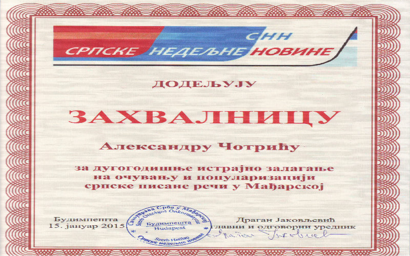 На свечаности у Удружењу књижевника Србије, одржаној 22. јануара, Александру Чотрићу, потпредседнику СПО и народном посланику уручена је Захвалница Српских недељних новина из Будимпеште за „дугогодишње истрајно залагање на очувању и популаризацији српске писане речи у Мађарској“.